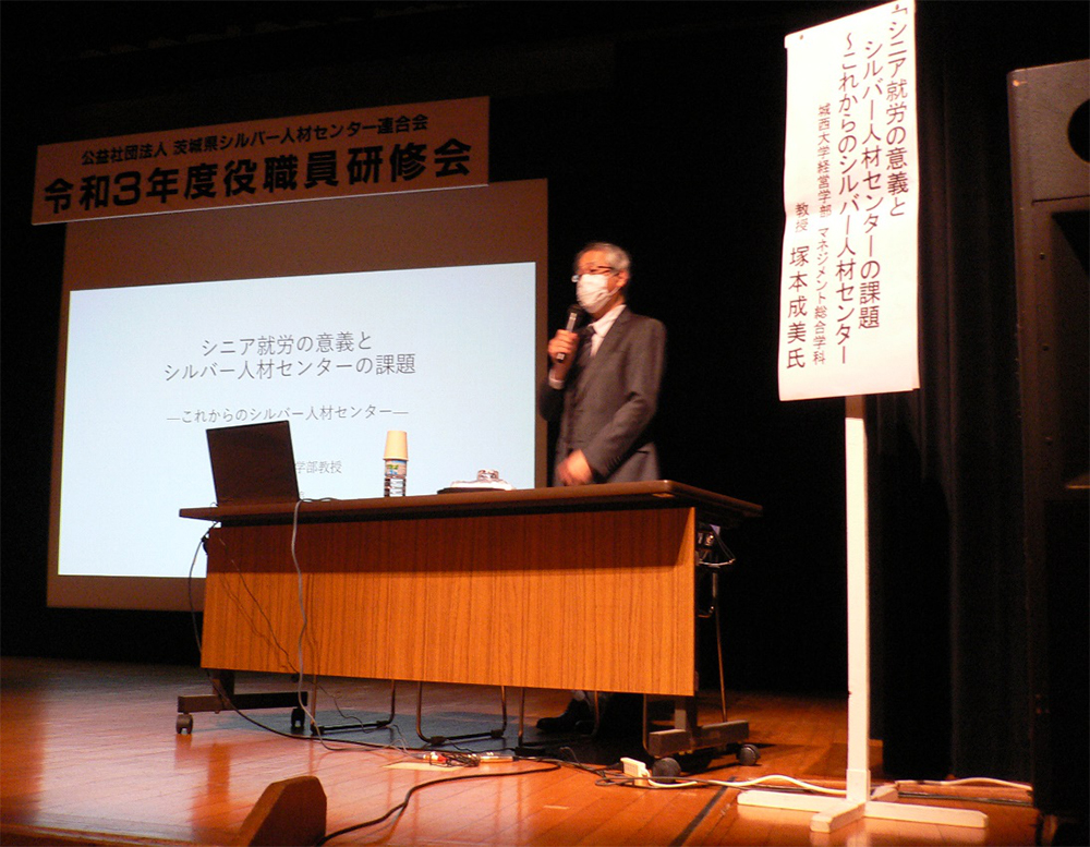 コロナ感染防止のため入場者数を制限し、各シルバー人材センターから理事長、理事をはじめ100名の皆様にご出席をいただき、城西大学経営学部 塚本成美教授による「シニア就労の意義とシルバー人材センターの課題~これからのシルバー人材センター」の講演、続いて公益社団法人草加市シルバー人材センター(埼玉県)の岡田卓也事務局長による「会員拡大の推進事例について」のDVD放映が行われました。高齢者と仕事を地域の中で結びつける組織としてのシルバー人材センター活動の意義について、改めて認識することができたのではと思います。