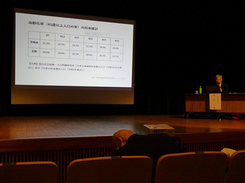続いて、県シ連 長山 優 常務理事兼事務局長から、「本県のシルバーを取り巻く最近の動向等について」と題して、高齢化の推移や会員拡大等の取組などの説明があり、また、講演の中で会員拡大取組の好事例として、日立市シルバー人材センター鈴木理事長から、取組事例の発表をいただきました。